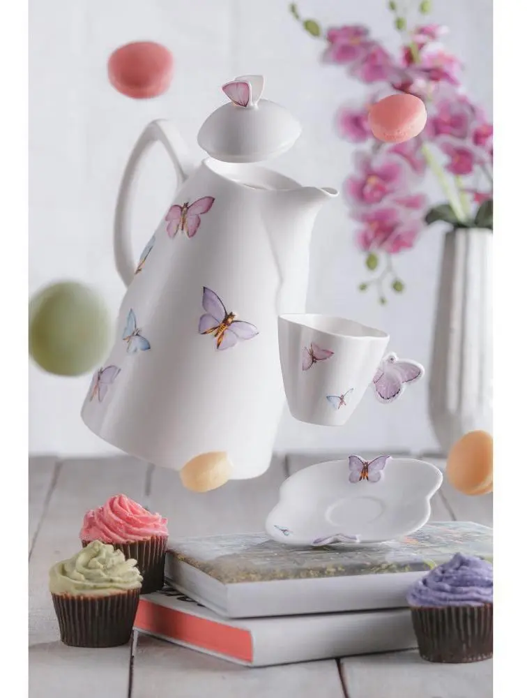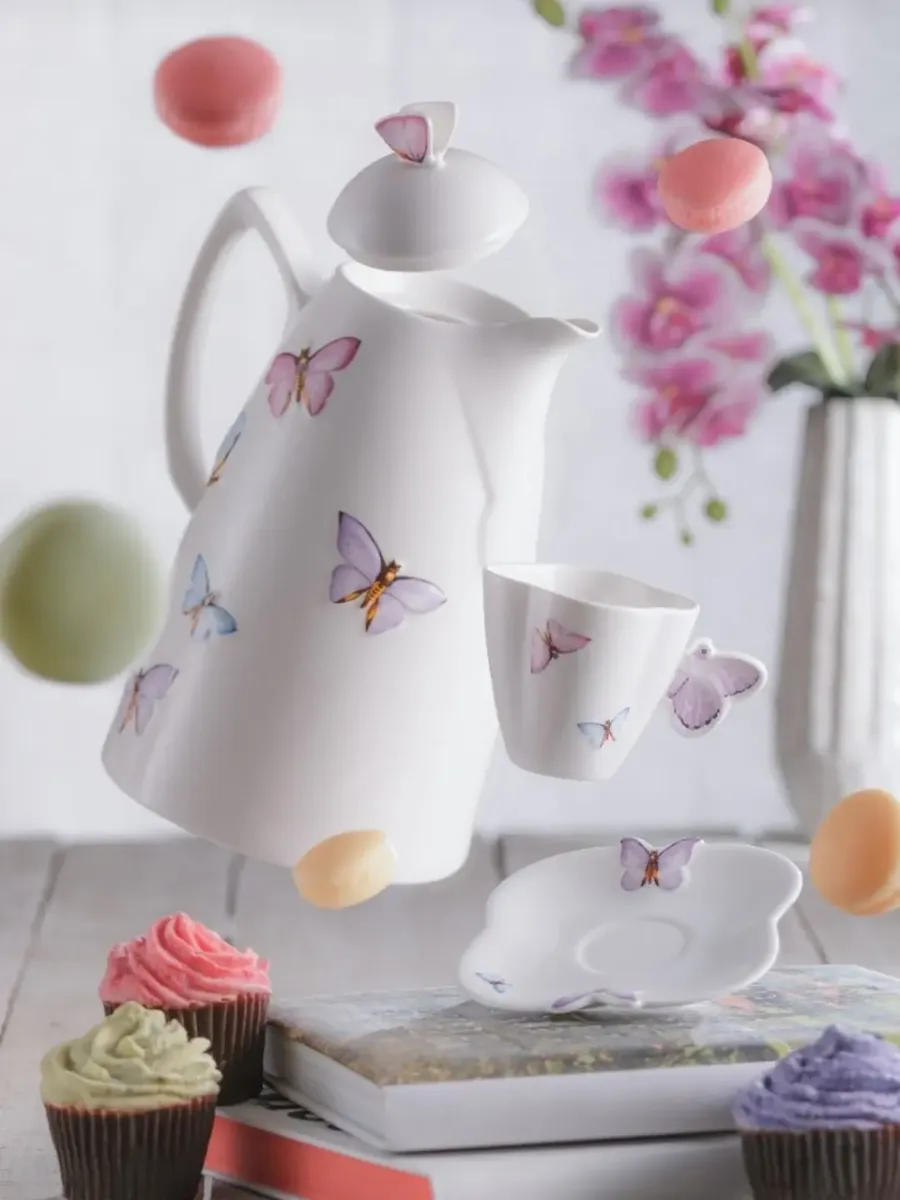- • Design sofisticado em porcelana com detalhes de borboletas, ideal para compor mesa posta