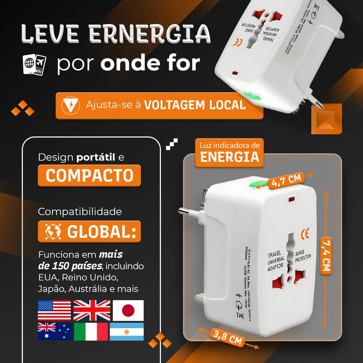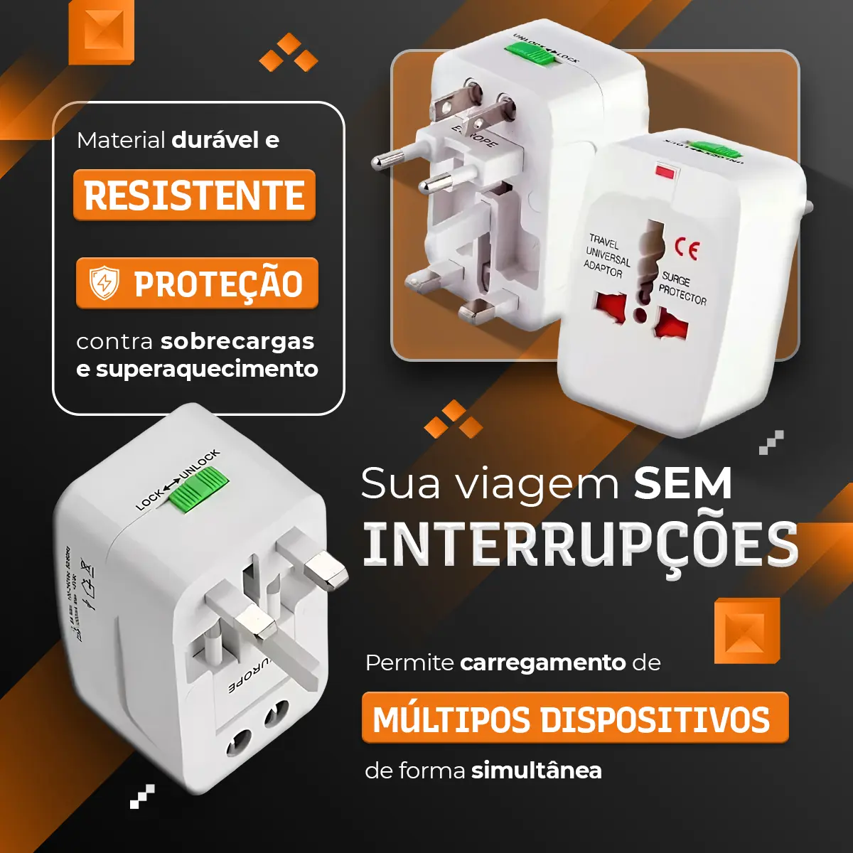 Voltagem: 127/220V. | Suporta corrente de 10 A, permitindo conectar eletrônicos de médio consumo como notebooks, tablets e carregadores. | Estrutura com 6 pinos retráteis que ajustam o encaixe para tomadas padrão europeu, americano, britânico e australiano. | Conexão com padrão de entrada americano para alimentar aparelhos que utilizam este formato em mais de 150 países. | Construção em plástico e metal resistente para manter a integridade física durante o transporte constante em bagagens. | Design que permite a transição entre diferentes padrões elétricos internacionais sem a necessidade de adquirir extras.