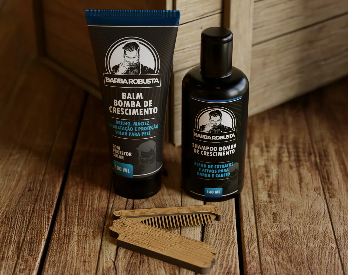 - • Kit completo com Shampoo, Balm e Pente de madeira incluso como brinde